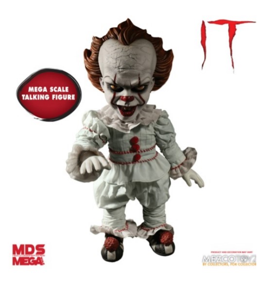 The M.D.S. Mega Scale Talking Pennywise stands at a forbidding 15” tall, is dressed in a real cloth clown suit, is fully articulated and says some of his most nightmare-inducing phrases from the film.